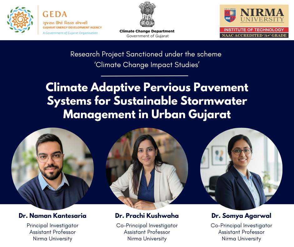Grateful to share that our research project on Climate Adaptive Pervious Pavement Systems has been approved by the Climate Change Department, Govt. of Gujarat with ₹20 lakh funding for 3 years. Looking forward to impactful outcomes in sustainable urban infrastructure.
